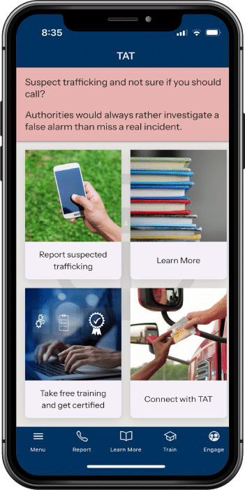 The TAT app can be downloaded from the Google Play or Apple Store. The TAT app continues to be updated and provides the best numbers to report human trafficking based on your location and easy reporting options, access to sex and labor trafficking red flag indicators tailored to niche sectors of transportation, information on service providers by state, and more information on human trafficking.